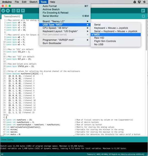 Para programar la placa teensy, necesita descargar el complemento teensyduino. Siga todas las instrucciones de esa página para una instalación correcta. Después de instalar el Add-on para el flasheo de la placa teensy, tendrá que seleccionar la tabla en el menú tools -> board y luego en el menú Herramientas -> USB tipo -> MIDI