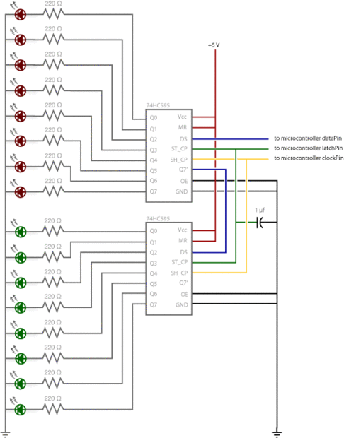 La parte de "salida de la serie" de este componente proviene de su perno extra que puede pasar el serial información recibida desde el microcontrolador hacia fuera otra vez sin cambios. Esto significa que puede transmitir 16 bits consecutivos (2 bytes) y los 8 primeros atravesará el primer registro en el segundo registro y expresarse allí. Usted puede aprender a hacerlo en el segundo ejemplo. "los 3 Estados" se refiere al hecho de que se pueden definir los pines de salida como sea alto, bajo o "alta impedancia". A diferencia de los Estados alto y bajo, usted puede "t set pins a su estado de alta impedancia individualmente. Sólo puede establecer el chip todo juntos. Esto es algo muy especializado para hacer: pensar en una matriz de LED que deba ser controlada por microcontroladores completamente diferente según un modo específico incorporado en su proyecto. El ejemplo ni aprovecha de esta característica y ganó "t generalmente necesidad de preocuparse por conseguir un chip que tiene. (Fuente: www.arduino.cc)