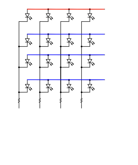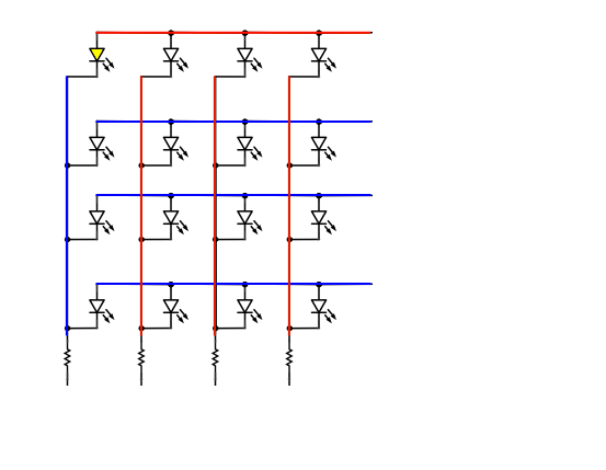 ¿Cómo enviamos datos a una fila a la vez? Si conectamos cinco voltios (rojo) a una fila y conectar a tierra (azul) a los otros tres filas y recorrer cada fila uno por uno, se verá algo como la figura 1. Ahora la imagen que mientras una de las filas está en + 5, conectamos una de las columnas al suelo. Como se muestra en la figura 2, esto hará que el LED en el cruce de la fila de + 5 y GND columna para iluminar. Esta manera, podemos hacer frente a cada uno de los 16 LEDs de la matriz individualmente usando conductores solamente ocho (cuatro para las filas) y cuatro a las columnas.