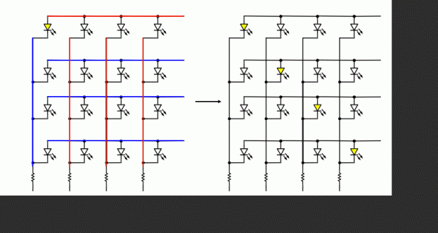 Ahora mire la imagen de abajo. Imaginar si nos muy rápidamente enciende el LED en la esquina superior izquierda (posición 1,1), entonces el LED en (2.2), entonces (3,3) y (4,4), y entre estos cuatro LEDs muy rápidamente (cientos de veces por segundo). Parecerá que los cuatro de estos LEDs son en un mismo tiempo (como se muestra en la imagen derecha de la imagen de abajo). Estudia el siguiente diagrama y convencerse de que esto es cierto.
