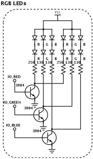 Inicialmente tenía tres sistemas de LEDs RGB en paralelo, conducido por el 3904s. Después del primer prototipo que decidí agregar un cuarto LED y topa para arriba la tensión de alimentación a 9V por lo que pude colocar dos de ellos en serie. Nota: tuve que ordenar nuevos LEDs para esto porque los que compré inicialmente eran ánodo común que me impedía ser capaz de controlar los tres canales cuando se cablean en serie, así tenlo en cuenta si usted está planeando en hacer algo similar.
