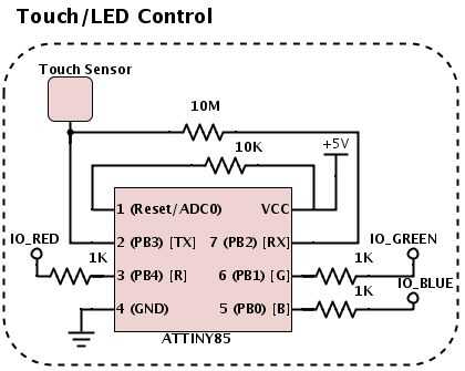 Después de mucha deliberación acerca de las características que quería implementar decidí que necesitaba tres canales PWM (para los tres canales de LED) e i/os digitales dos-el ATTINY85 que había trabajado con antes tendría suficientes puertos, y puede ser programado usando el medio ambiente y las bibliotecas de arduino. El sensor de contacto es simplemente una placa de metal.