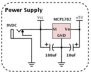 Inicialmente esperaba alimentar todo el sistema de 6V con la opción de la utilización de algunas pilas de botón. Sin embargo, al final opté por una fuente de 9V ya que fueron más frecuentes y me permitieron poner 2 LEDs en serie para reducir mi sistema actual. Utilicé un regulador de 5V básica (para el suministro de micro controlador) con mucho extra filtrado en la entrada porque estaba manejando el circuito de audio directamente desde los 9V.