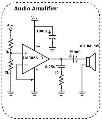 He modificado mi circuito amplificador básico original para hacer un poco más robusto. Esta configuración se toma del datasheet del LM386 y funciona bien. Aviso la capacitancia adicional en el suministro de pin-it es muy importante tener cierta capacitancia muy cerca de este pin en tu tablero.