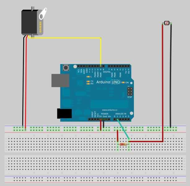 Deja vu - esto suena tan familiar. Vamos a conseguir tanto el servo y el sensor de luz de circuitos en el protoboard como se muestra en el diagrama y luego subir nuestro próximo bosquejo.