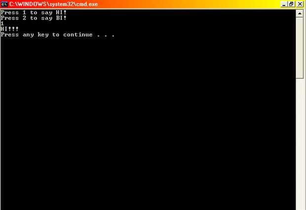 Esto dice la computadora que si escribe 1, debe echo HI!, y si decimos 2 debe echo BYE!!