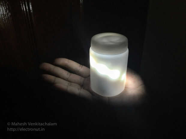 Para que la lámpara de noche, elegí una botella de plástico translúcida barata. La tira del LED es caliente pegado dentro de la botella en forma de hélice, y el PCB y 9V de la batería están también semejantemente colas a la botella.