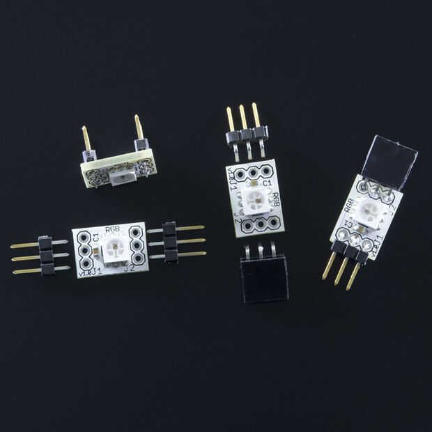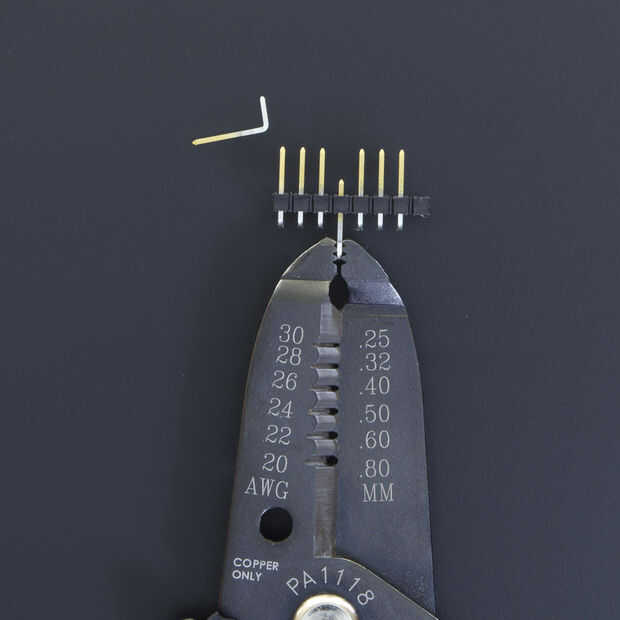 En primer lugar, queremos preparar el WS2812 Breakout Boards para colocarlas en la placa sin soldadura. Para hacer esto, usamos un cortador de alambre (corte más comun herramientas funcionará igual de bien) para separar cada tira de 8 pines en piezas de 2 x 3-Pin. Tenga en cuenta que hacer el corte es un poco complicado; muchas veces he intentado utilizar la ranura entre dos jefes masculinos como una guía para el corte, y he terminado corte demasiado plástico de una cabecera que quería mantener.