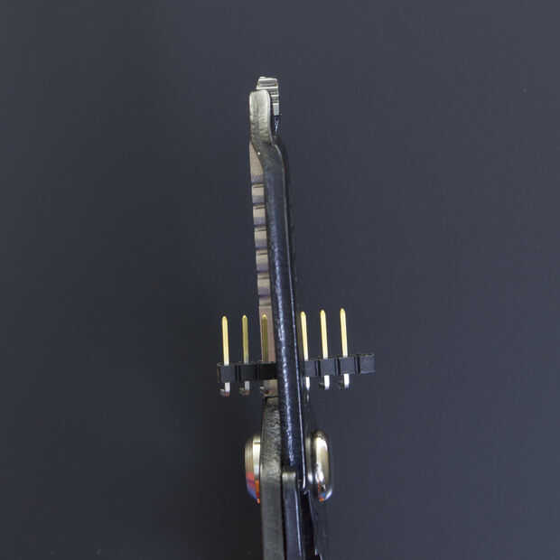 'Sacrificio' de la clavija donde queremos hacer el corte, evitamos el problema en conjunto. Usando un par de pinzas, tire el pasador donde queramos cortar (en este caso, el pin 4 y 8). Después de que los pasadores se han quitado fácilmente podemos cortar por la mitad de las cabeceras de la ahora vacía. Esta técnica funciona igualmente bien con la cabecera de la mujer.