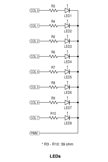 Cada uno de los ocho LEDs puede tener su propio nivel de brillo. Brillo se especifica (firmware) en número de 8 bits 0 - 255. Rutina de interrupción del contador de tiempo Lee los niveles de brillo y activar/desactivar cada LED por lo tanto, en sincronía con la señal PWM de hardware. (Frecuencia PWM es 31.25 kHz. Interrupción se produce cada 32 microsegundos con firmware versión 1.0)