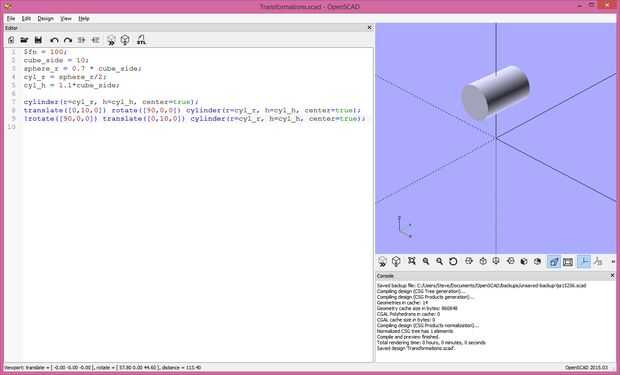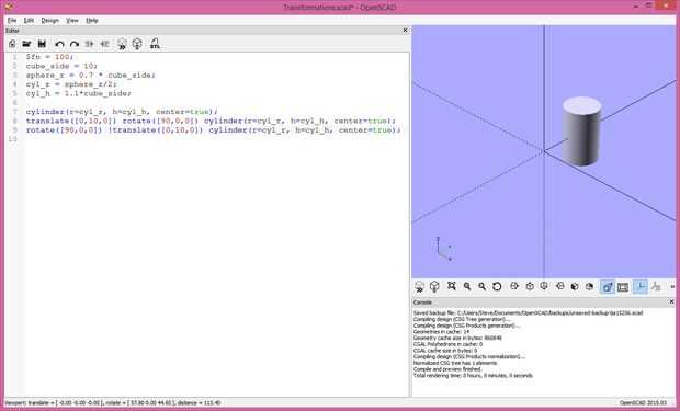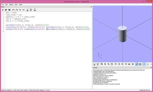 Ahora nos movemos a través de la transformación de translate([0,10,0]) y uso el "!" modificador para ver lo que pasa. El cilindro ha avanzado 10 unidades en la dirección Y. Tenga en cuenta que el cilindro está aún de pie, no rota como línea 2. Es la misma traducción como línea 2, pero antes de la rotación.