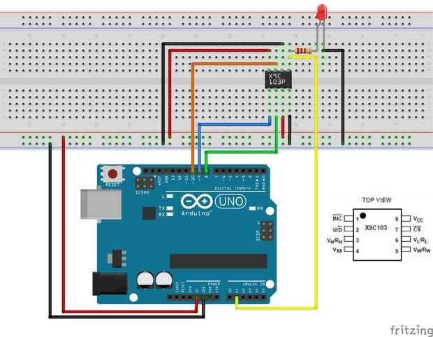 El diagrama de fritzing muestra un tablero con 830 atar puntos para mayor claridad. El escudo de prototipos tiene conveniente + 5V y GND rieles y pernos de Arduino son llevados al nivel superior pero añadirían cierta confusión cuando se muestra un diagrama.