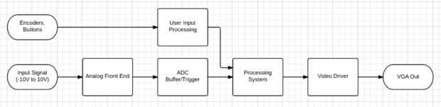 Este tutorial fue escrito desde mi experiencia en CPE439 de Cal Poly SLO: curso sistemas embebidos en tiempo Real. Una buena aplicación para esta parte de Zynq es un osciloscopio: la PS puede manejar el menor tiempo las operaciones críticas (interfaz de usuario, gráficos de dibujo), mientras que la PL puede manejar las operaciones críticas del tiempo (entrada ADC tampón, disparo, señales de temporización de VGA). Este osciloscopio fue diseñado para cumplir con algunas especificaciones básicas: