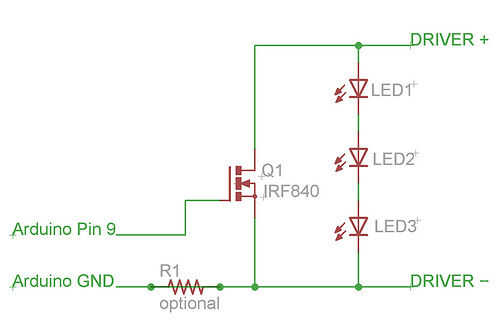 El truco es usar un FET (Field Effect Transistor) para omitir el controlador actual alrededor de los LEDs como se muestra en el esquema arriba.