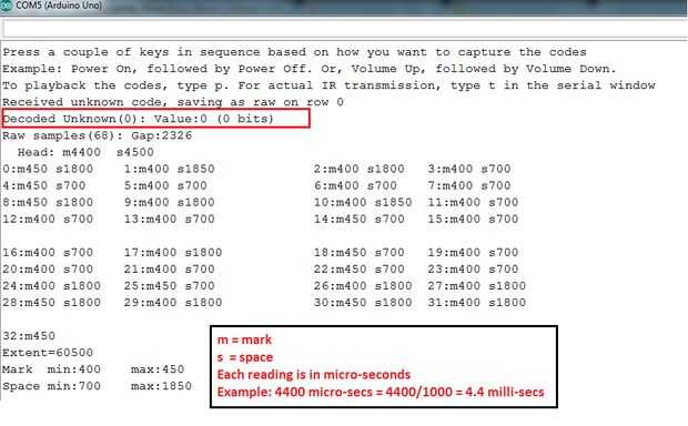 - Si IRLib no entiende el presente Protocolo, el receptor IR capturará el crudas secuencias de marcas y espacios, pero no se puede leer el código de protocolo de señal