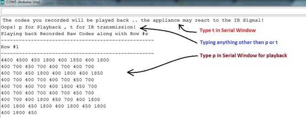 Cuando esté listo, debe ser capaz de capturar un par de códigos y luego reproducirlas con el comando 'p'. Sin embargo, no cierre la ventana de Serial!