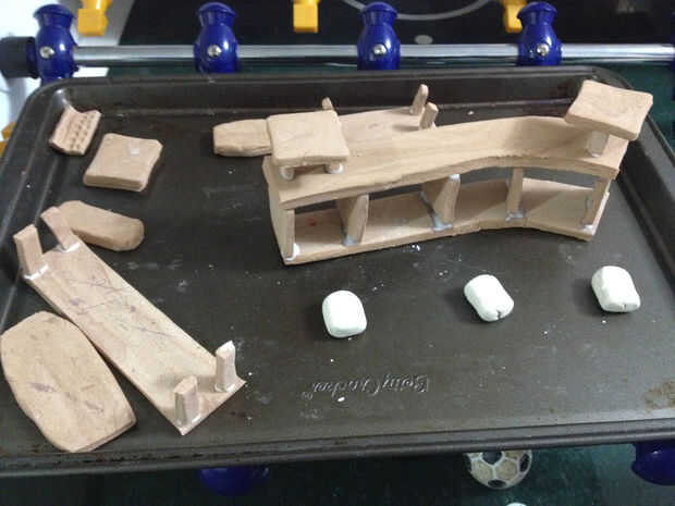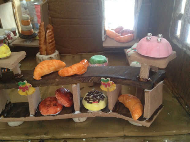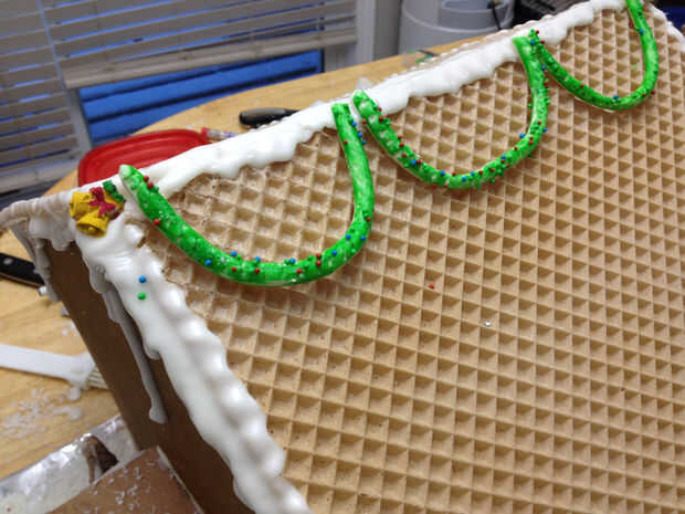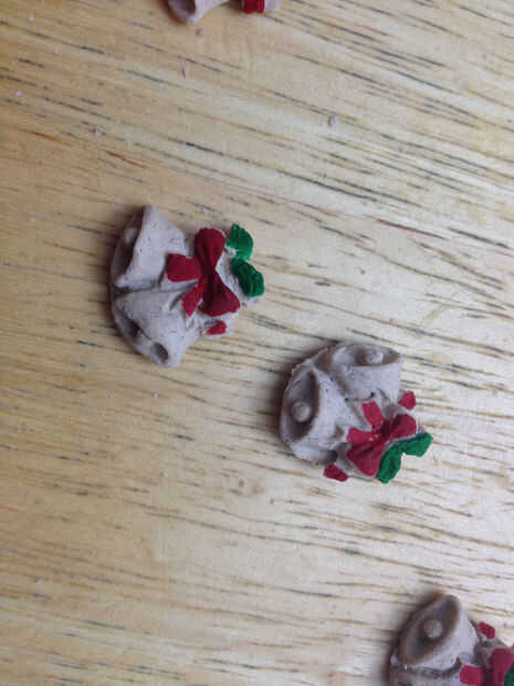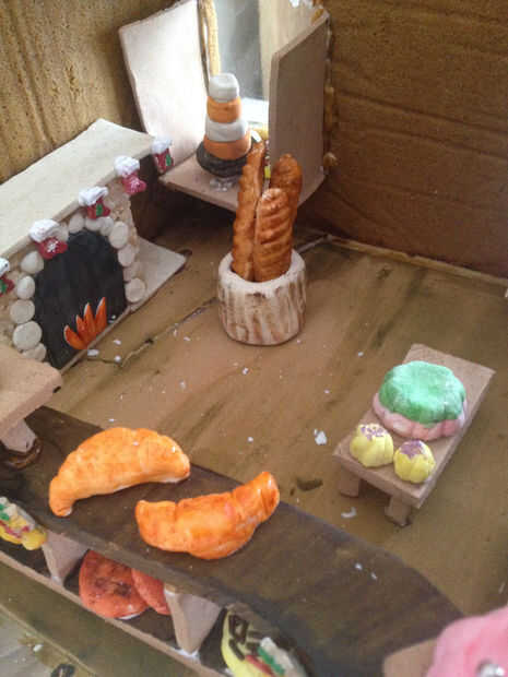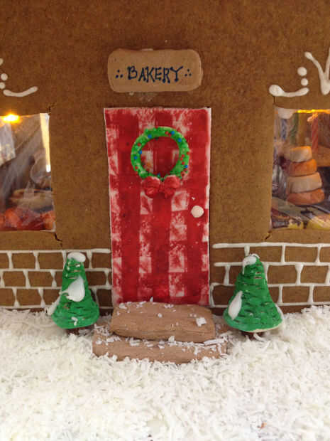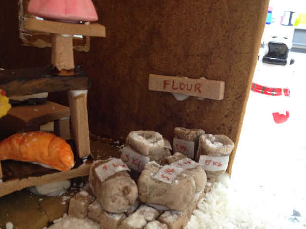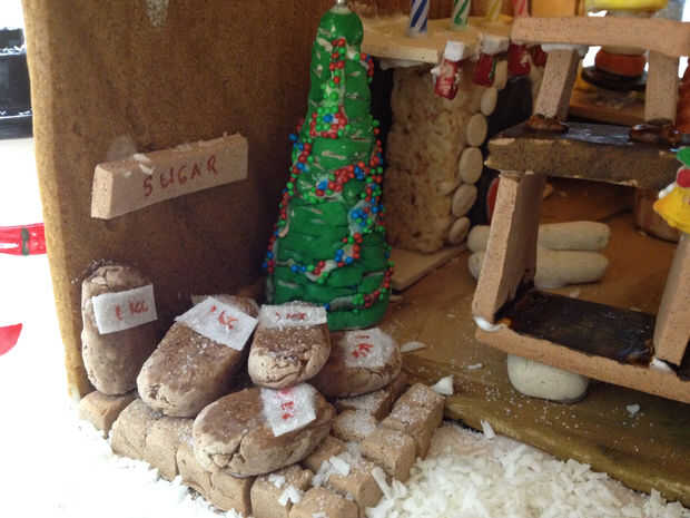 Tablas, azúcar y bolsas de harina, Navidad árboles, medias, maderas, troncos, pasos, campanas, piso y chimenea exterior, están hechas de arcilla de pan de jengibre, coloreadas con colorante comestible