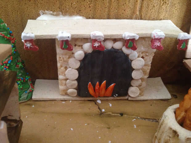 Chimenea de interior está hecho de arroz krispies trata mientras que las decoraciones están hechas de arcilla jengibre y fondant, coloreadas con colorante comestible. No en la foto, en la parte superior la chimenea pegué velas reales.