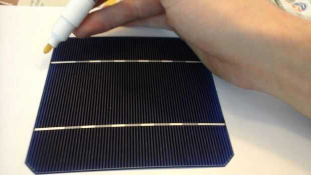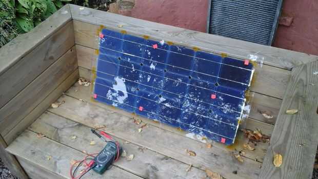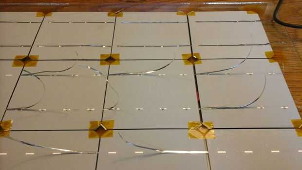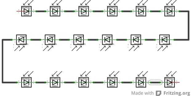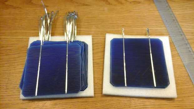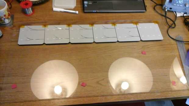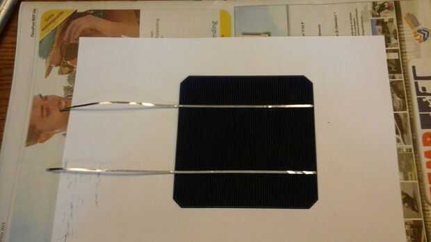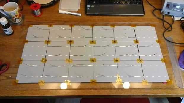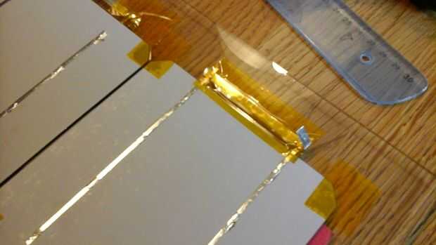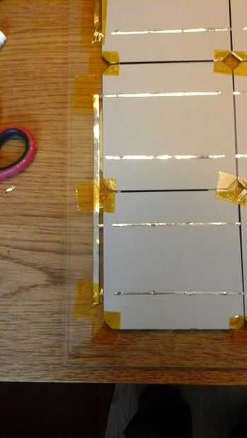 Las células sólo producen 0.5V cada uno, así que las células necesitan estar conectados en serie. Si usted tiene tantas células como usted va a necesitar (como si me hubiera) debe ser muy cuidadoso al manipular las células. El paquete dice que las células son tan frágiles como cáscaras de huevo y al manipular estas células, usted descubrirá que esto es realmente un eufemismo. Son extremadamente frágiles y poco flexible. Porque quería manejar las células lo menos posibles, soldado el directamente en el panel de vidrio. De esta forma que no necesitará de moverlos al vidrio cuando estoy hecho. Un inconveniente de esto es que el vidrio es un disipador gigante, por lo que las células reciben algunos más tensión de las diferencias de temperatura.