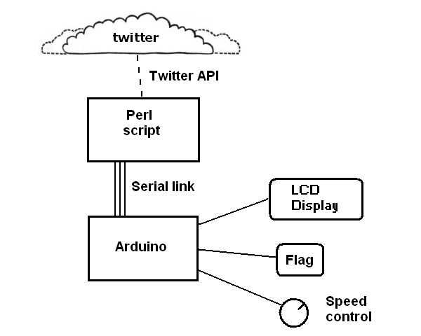 El hardware de forma interfaz de Arduino con el mundo real. El hardware consiste en un LCD de caracteres dos líneas para la visualización de mensajes, un control de velocidad que permite haces cambiar la velocidad de desplazamiento mientras el dispositivo está funcionando y una bandera de servo-operado que se plantea cuando el script detecte hay tweets sin leer.
