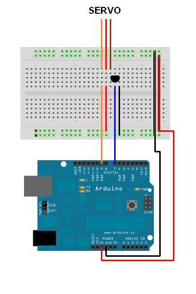 Si desea utilizar el servo, asegúrese de que tener su Arduino conectado a una fuente de alimentación externa (USB no va a dar bastante jugo) y poner el condensador electrolítico entre el poder carriles para proporcionar corriente de espiga.