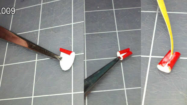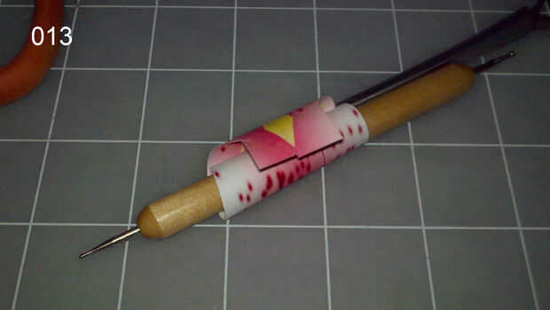 7 cortar y moldear las puntas hacia el centro con el rojo en el exterior utilizando un palillo de dientes, luego pegamento 8 entre los rizos. (imagen 009) Hacer 5 de estos.