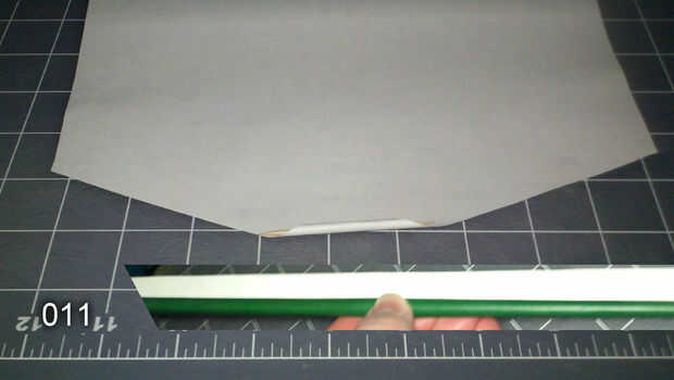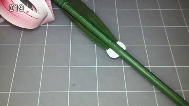 Cubrir el lado blanco de 11 con pegamento, luego coloque el lado más corto sobre el tallo, cubriendo las pestañas de los pétalos. Envuelva el 11 alrededor del tallo, que cubre todas las pestañas y suavizar la transición entre la floración y la madre. (foto 018)