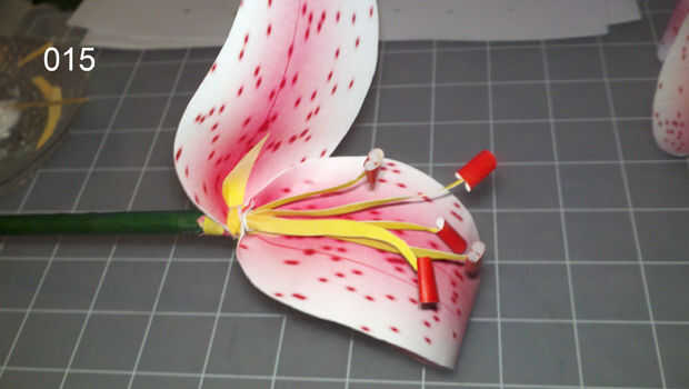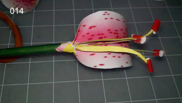 Pegar un pétalo ancho justo debajo de los estambres, envolviendo las dos lengüetas pequeñas alrededor del tallo. El lado del pétalo que va hacia la madre es el único verde amarillo resaltando, y el lado de la madre tiene el estallido de color verde amarillo destacar. (foto 014)