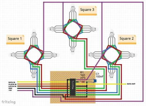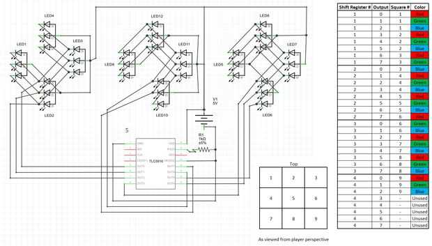 Cada plaza de juego de los 9 total requerirá de 3 salidas (RGB) de un registro de cambio. Esto significa 27 salidas totales. Así un total de al menos 4 registros de desplazamiento. Los registros de cambio serán conectados por la imagen adjunta. El primer esquema que se muestra es un ejemplo del primer registro al primer 3 juego plazas. Puesto que existen 9 conexiones led y solo 8 salidas disponibles en este registro de desplazamiento, el siguiente registro de desplazamiento manejará el LED azul de juego cuadrado 3.