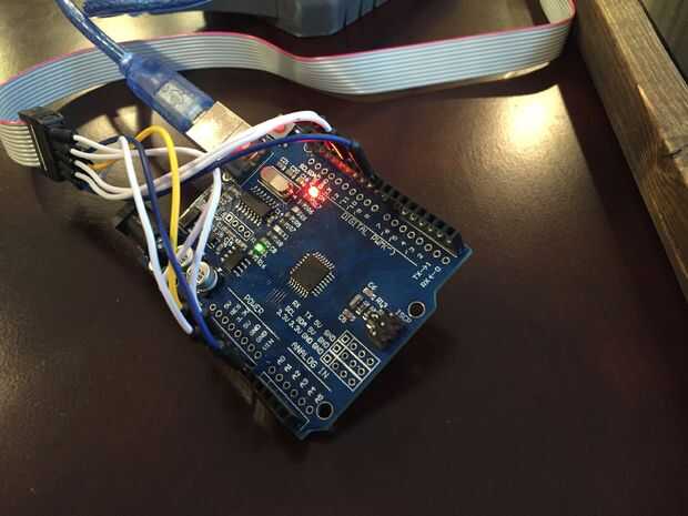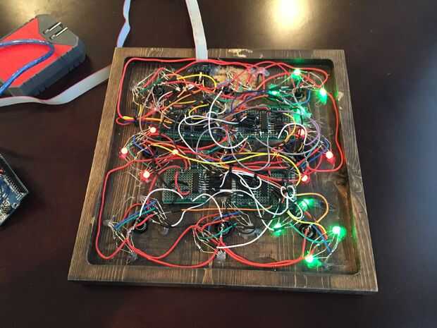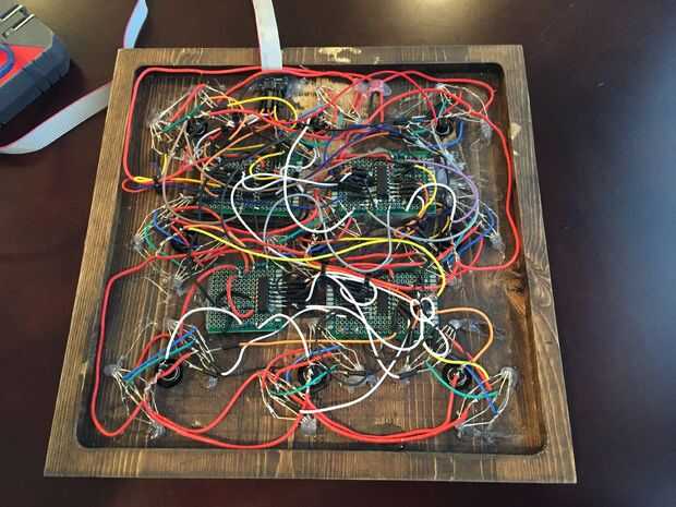 Inserte el 36 LEDs de RGB ánodo común en los orificios hasta que hacen contacto con la cama de acrílico. Si los orificios son de gran tamaño puede poner un poco de pegamento caliente sobre el LED para sostenerla en lugar. Conectar el ánodo, terminales rojas, azul y verdes de 4 LEDs en cada juegan de cuadrados. Vamos conectar 4 LEDs en paralelo a las salidas del registro de desplazamiento. Los terminales de ánodo común pueden ser conectados a través de todos los cuadrados de juego 9 a 1 pequeño perfboard. El conjunto de superficie de juego finalmente incluye un cable de cinta con más de 5V, GND, datos, reloj, pestillo, 5V + y señal de las conexiones.