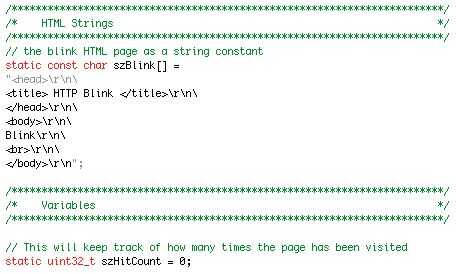 Abrir la pestaña de "HTMLBlink.cpp" otra vez y Desplázate hasta la sección denominada "Cadenas de HTML". Encontrarás que una variable llamada "szBlink" que contiene la secuencia de la prueba en realidad es nuestra página HTML de blink. Quite la línea "Esto es una simple página de blink HTML que fue dinámicamente." y sustituirla por simplemente "parpadear".