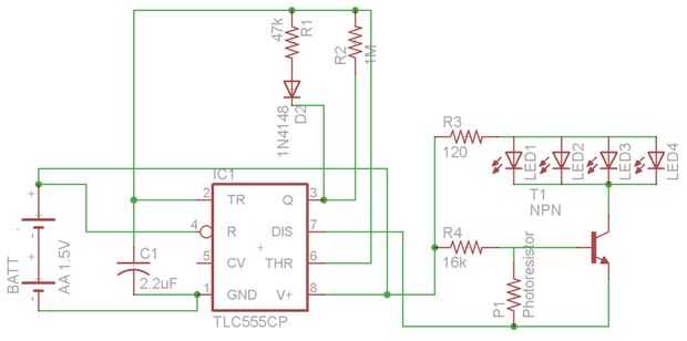 En condiciones de oscuridad, el valor de la resistencia es muy alto, así que la mayoría de la venida actual de V + en el temporizador 555 (V + es el voltaje positivo) va a ambos directamente a la base del transistor, lo que es operacional y a los LEDs.