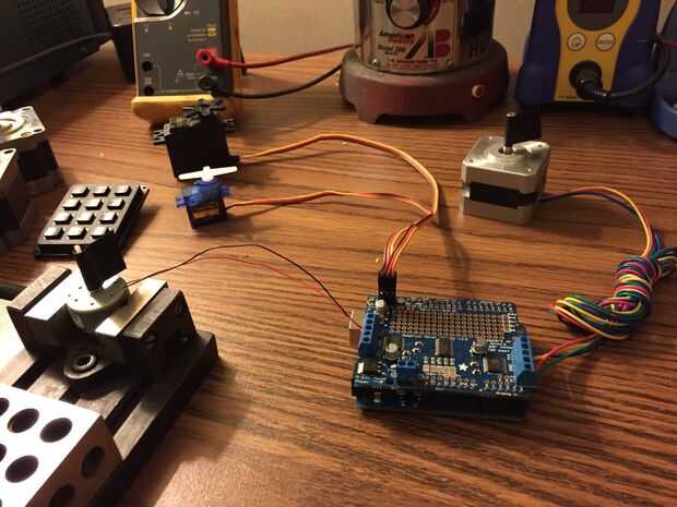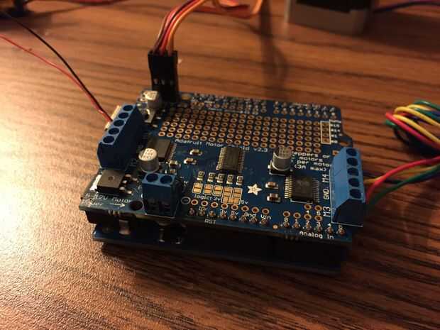 del partido. Usé 2 servomotores, 1 motor paso a paso y 1 motor de corriente continua. Usted también necesitará un Arduino Uno, un Adafruit protector de Motor y un separado 5-12vdc fuente de alimentación para los motores.