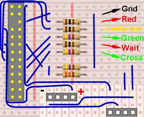 La última muestra de diagrama donde se deben soldar los cables desde el rojo, ámbar, verde, esperar y Cruz de LEDs. La conexión de retorno común de todos los LEDs se muestra en negro como toma de tierra.