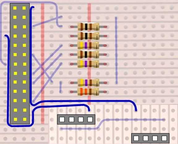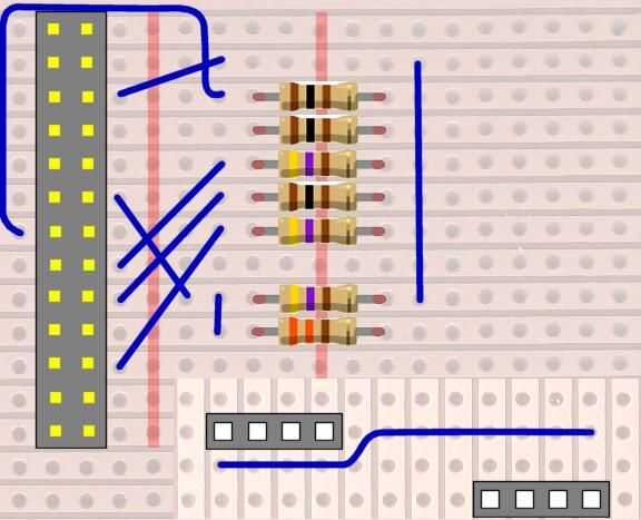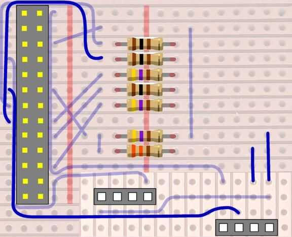 Todas las resistencias en lugar de la soldadura y la soldadura de las dos tomas de encabezado de 4 vías pin a la Junta más pequeñas como se muestra. (Esto va pegar en lugar más adelante.)