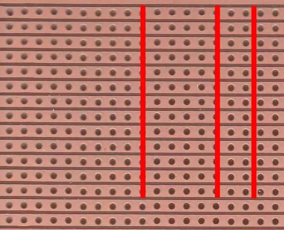 En la pieza más grande, corte 13 pistas como se muestra por las 3 barras rojas (o 20 pistas si está usando una cabecera de 40 pines). El corte más cercano el borde debe ser entre dos filas de agujeros para que la tira de pines puede ser soldado al cobre ambos lados del corte. Los otros dos cortes son mucho menos importantes. Para cada uno, utilice un cuchillo y una regla de acero para anotar dos cortes y luego levante el cobre entre los cortes.