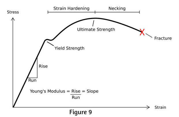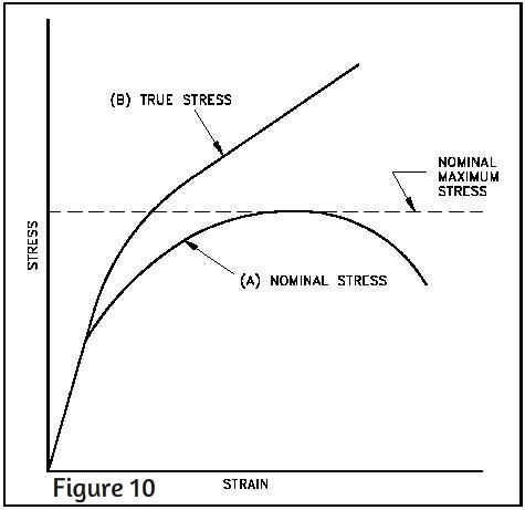 ¿Pero si el área transversal disminuye, no significa que aumento de la tensión? Recuerde que el estrés = fuerza/área. Un área más pequeña significa una tensión más grande. Pero la mayoría gráficos de tensión muestran una disminución en la tensión en la parte de estricción de la curva! Esto es porque el cambio en el área transversal de la muestra de huesos de perro no se se tiene en cuenta. Un cálculo de corrección se podría hacer para indicar lo que sería la verdadera tensión en este punto en el proceso de carga de tracción y se daría una nueva curva tensión/deformación (como se ve en la figura 10).