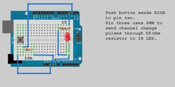 Como una nota; mi foto me muestra utilizando un 15 Ohm, resistor de 1/2 Watt para limitar mi LED infrarrojo. Se supone que use un resistor de 100 Ohm 1/4 Watt. He probado eso pero sólo tiene cerca de 5 pies de gama con mi mando a distancia, por lo que intercambiaron a la resistencia de 100 ohmios para 5, resistencias 15 Ohm en serie (total 75 ohmios). Eso me dio un poco más de variedad, así que decidí quitar lentamente una resistencia de 15 ohmios en un momento hasta había redujo a un 15 Ohm, resistor de 1/2 Watt. Estoy seguro de esto no es la mejor manera de tratar el LED infrarrojo, pero funcionaba así que me quedé con él. Rajado abrir un mando real y utiliza un transistor SMT pequeñito pero no pude averiguar el esquema que utilizaban. Con la una resistencia de 15 ohmios acabé con los pies 25-ish de gama. Así que tómate esto como una advertencia de no a quemar por su IR LED! Esto es como lo hice, pero si estás incómodo con esto entonces lo jugar a seguro y quedarse con lo 100 Ohm, resistor de 1/4 Watt.