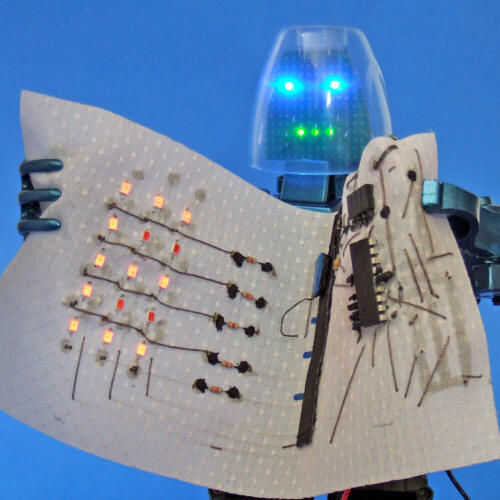 Apenas he empezado a explorar las posibilidades de los circuitos flexibles utilizando materiales conductores. No puede construir un circuito que enrolla totalmente. Pero las técnicas presentadas aquí muestran como se pueden hacer circuitos en cualquier material flexible incluyendo sombreros, papel, pantalones, caucho, camisetas, guantes, calcetines, carteras, inflables o chaquetas. También se pueden hacer sensores flexibles y pantallas de varias clases. El límite - es tu imaginación.