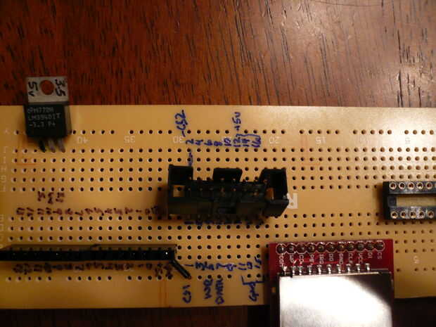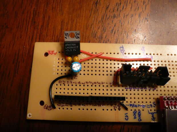 Empezar por todas las conexiones de cableado.  Seleccioné el carril detrás el LM3940 para la línea de alimentación de 3,3 voltios y el carril en el otro lado de la Junta como tierra.  Ejecute un cable de la clavija de salida del LM3940 al carril detrás de él.  Ejecutar otro cable desde el conector de tierra (pin central) en el riel en el lado opuesto del tablero.