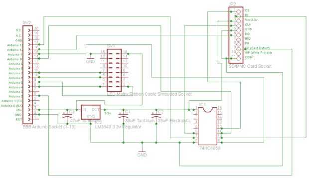 El 74HC4050 se utiliza para convertir señales de 5 voltios enviadas de la Arduino a 3.3 voltios requeridos por la tarjeta SD.  Hay 6 buffers en el 74HC4050, sólo tres son utilizadas por este circuito.  Todas las entradas vienen de Arduino, y las salidas van a la tarjeta SD.  El cuarto SPI conexión funciona directamente de en la tarjeta SD para Arduino digital pin 12.  (Arduino puede leer las señales de voltaje inferiores bien).