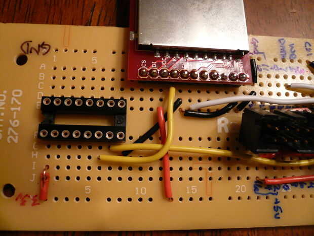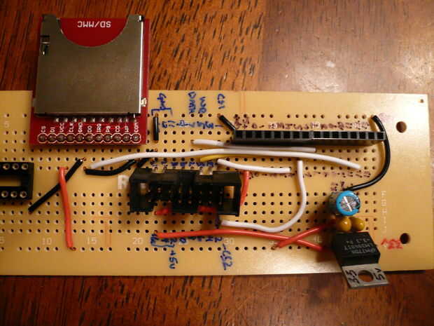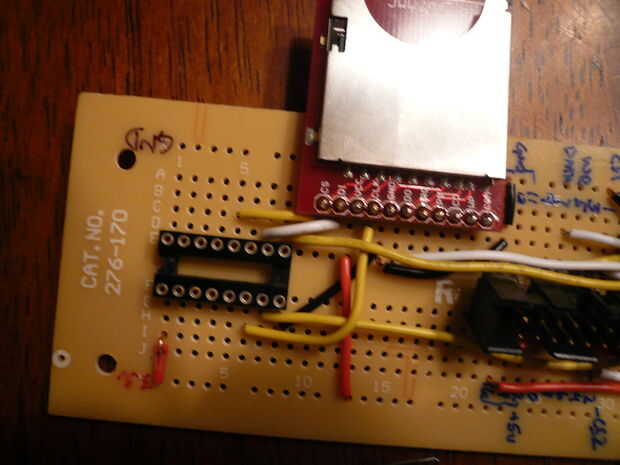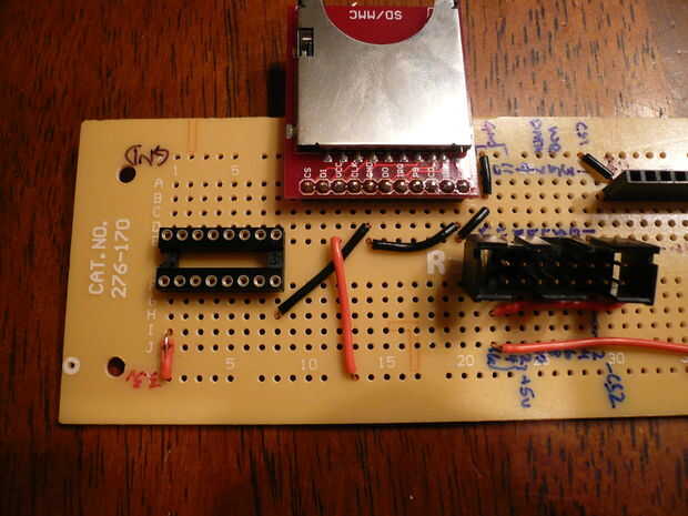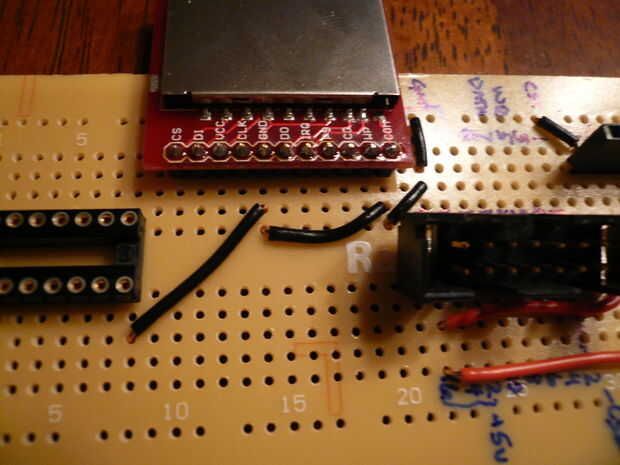 Para completar los carriles de la energía, conectar el pin 1 del DIP de 16 pines para el 74HC4050 en el riel de alimentación de 3.3 voltios. También Conecte el pin Vcc de la Junta de arranque SD-MMC en el riel de alimentación de 3.3 voltios.