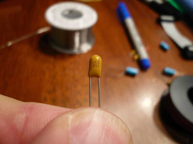 Un condensador de tantalio .47µF va entre el conector de tierra (pin central) en el LM3940 y su clavija de entrada. Este capacitor también es polarizado. Asegúrese que el pasador corto entra un pad conectado a tierra y el perno largo en un pad conectado al pin de entrada de 5v +.