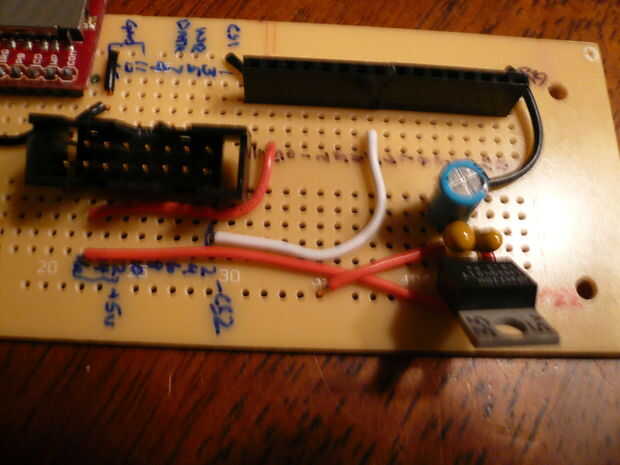 A continuación conecte el + 5v entrada el LM3940 a un pad conectado al pin 12, 14 o 16 de la cabecera de la caja y otro cojín conectado a esa línea de la cabecera de la caja, ejecute un cable a la línea de 5v que vendrá de la Arduino de BBB +. Pin 16 de la cabecera de la caja se utiliza para + 5v en las fotos de abajo. Esto completa la parte del regulador de voltaje del circuito.