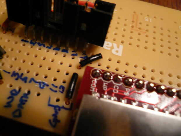 Una nota importante: la cabecera de la caja envuelta utiliza tiene conectores de ángulo recto. La placa de circuito impreso no tiene una forma de permitir las conexiones a cada pin, porque a cada lado de la Junta de los electrodos están conectados como estarían en un protoboard. Para resolver dobló los pernos de la escuadra caja encabezado por lo que encajarían en pernos de una hilera a cada lado de la brecha de la placa en el tablero. Una foto de abajo muestra los pines doblados. La cabecera se sienta en la Junta en ángulo, pero funciona muy bien. Tenga cuidado de no usar demasiada fuerza en la PCB, no fuerce la inserción para conseguir un mejor ajuste, o corres el riesgo de romperse el PCB en mitad (voz de la experiencia).