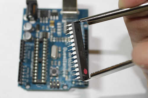 3. generalmente ahora cambiar el chip ATMega que falta con el nuevo chip ordenado. Asegúrese de que tiene el bootloader de Arduino, aunque!