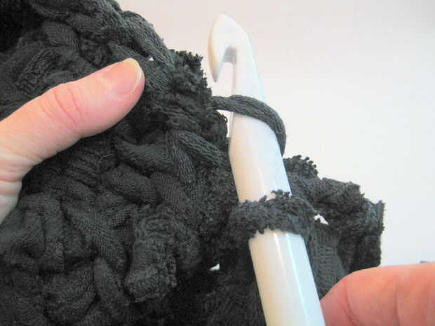 - Retire el gancho a través de sólo la primera puntada en el gancho. (Esto significa que usted debe tener una puntada y un bucle de la "nueva" sarn todavía en el gancho).