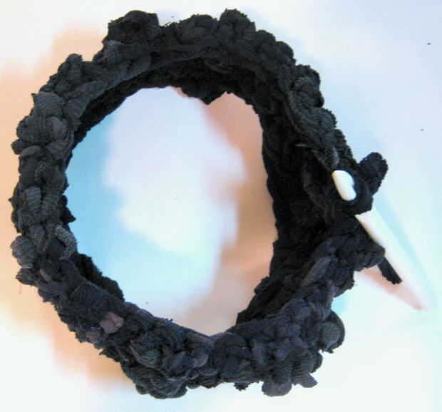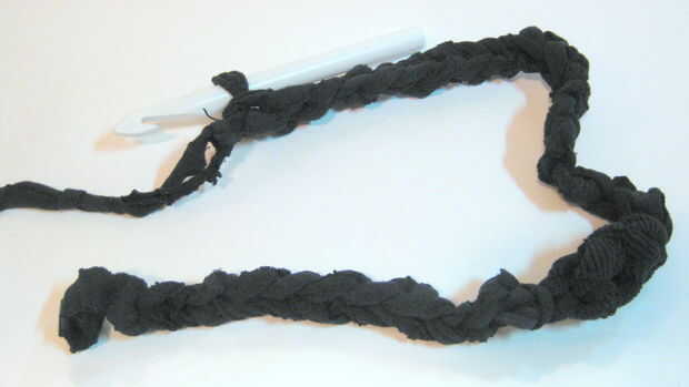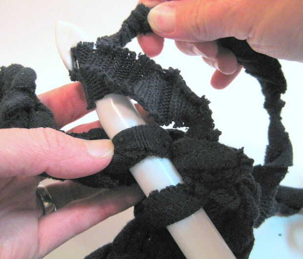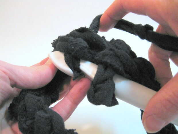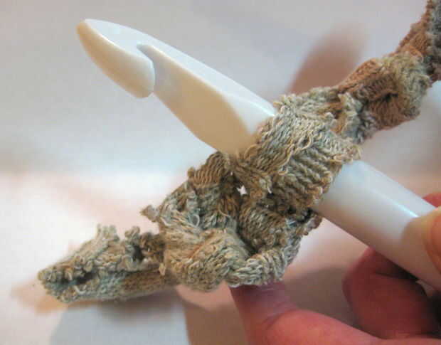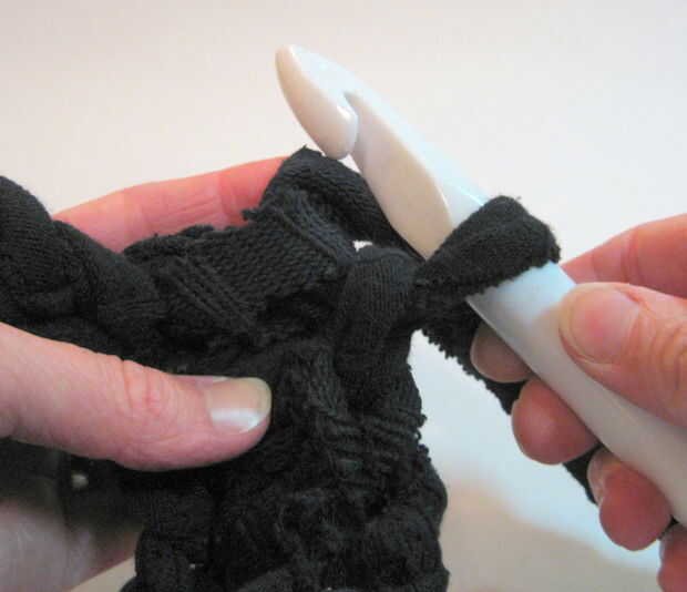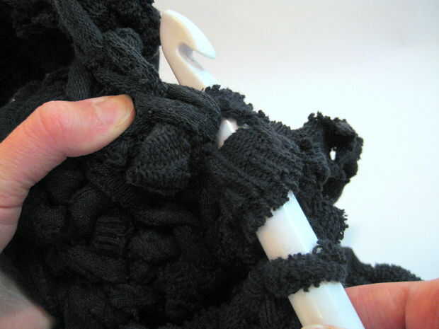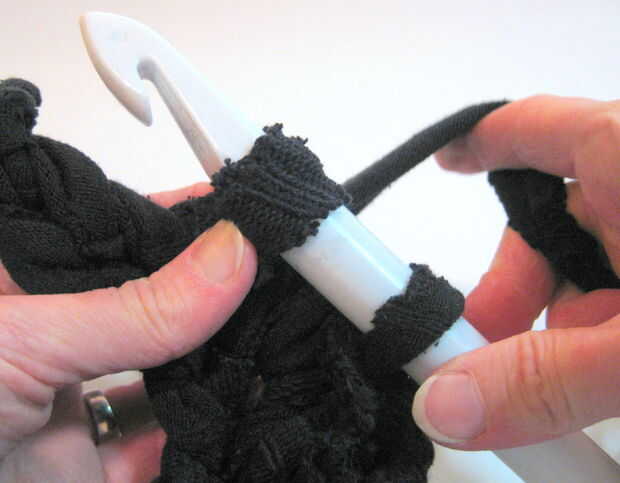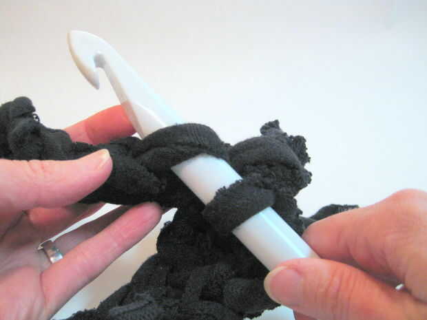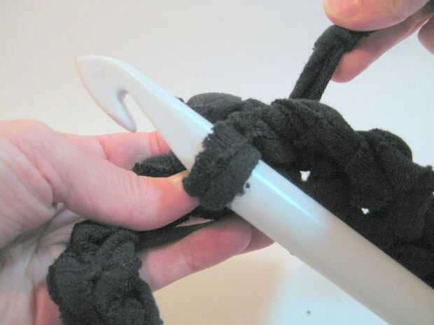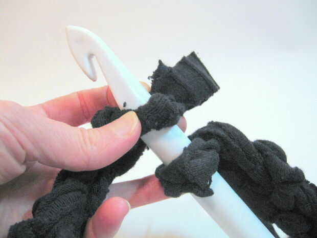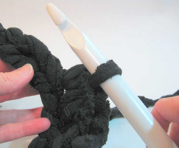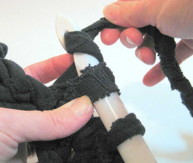 - Este tirón de tiempo el gancho a través de las cadenas que estaban en el gancho. Usted debe terminar con sólo la nueva sarn en el gancho.