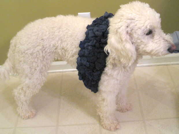 Después de hacer esta matemáticas, continué solo crochets alrededor de cada ronda y un punto bajo disminuir cada ronda. Sin embargo, no alcancé medición C porque no tenía suficiente sarn. En cambio, acabé haciendo tres rondas (después de la ronda inicial de cadenas) y se detuvo allí. (He añadido una cuarta ronda más tarde, cuando yo sabía que tenía extra sarn). Recomiendo probar el torso en el perro como vas a hacer que cabe como se esperaba, y no haría que la parte del torso llegar a toda la longitud de medición C porque esto puede ser difícil de encajar en el perro, haciendo cuatro rondas parecía funcionar bien para mí.