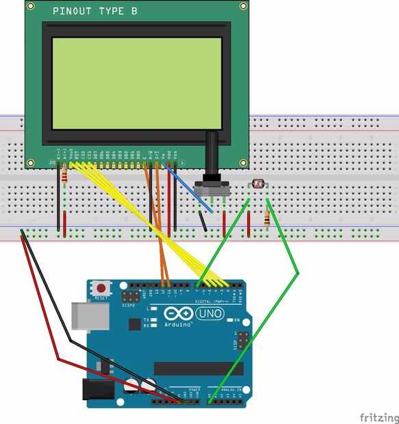 7) Coloque el potenciómetro en el protoboard, conectar el pin de un extremo a la energía y el otro a tierra. El pasador central debe conectarse el V0 en la pantalla LCD. Esto le permitirá cambiar el contraste de la pantalla.